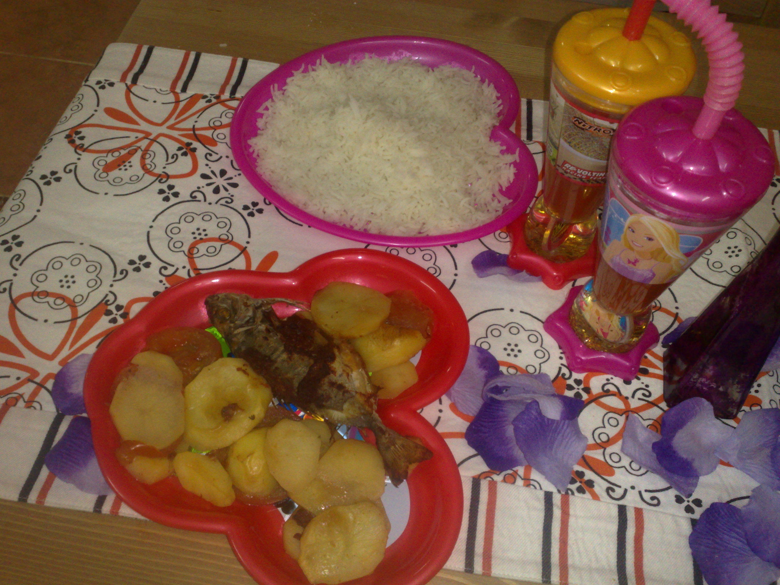 سمك بالفرن مع بطاطس ورز ابيض 0000كمان مااكلووه000اكله ابوهم بالعافيه عليه0000