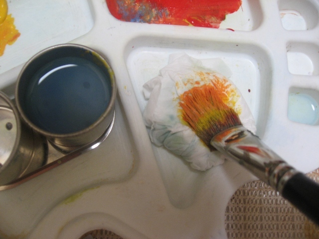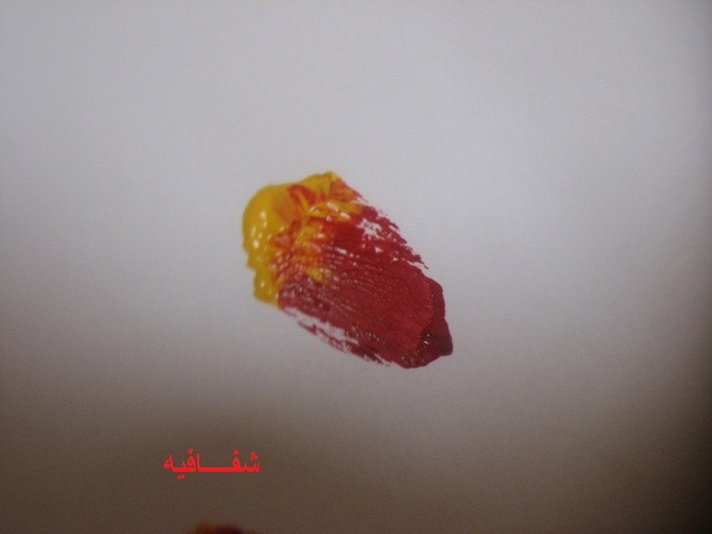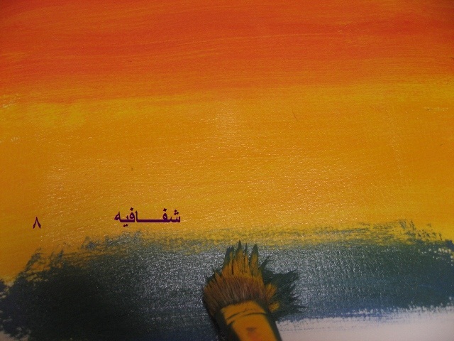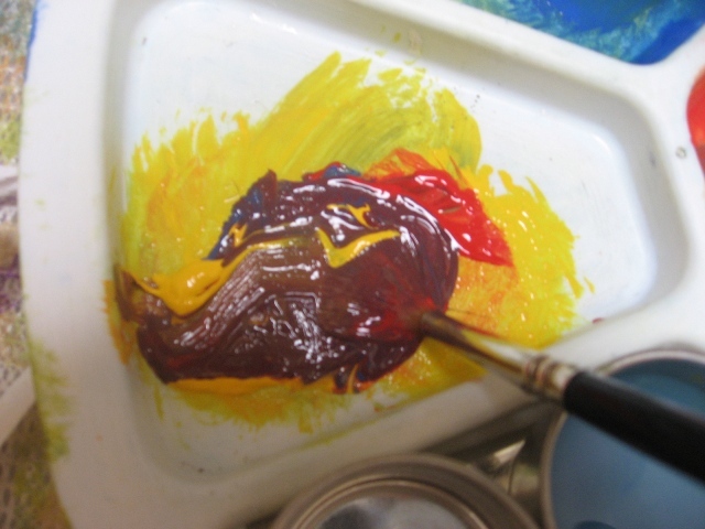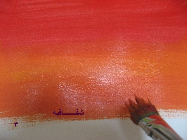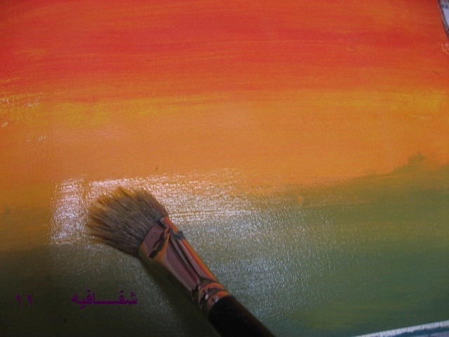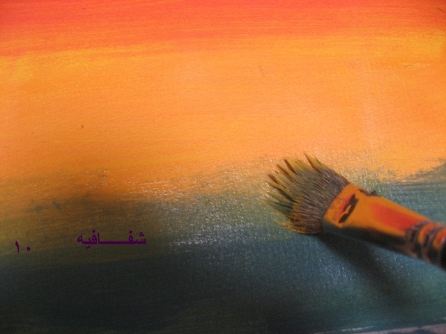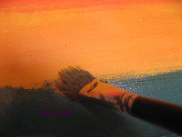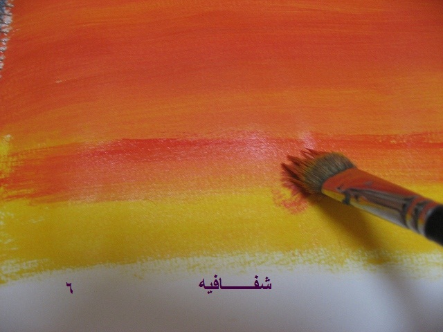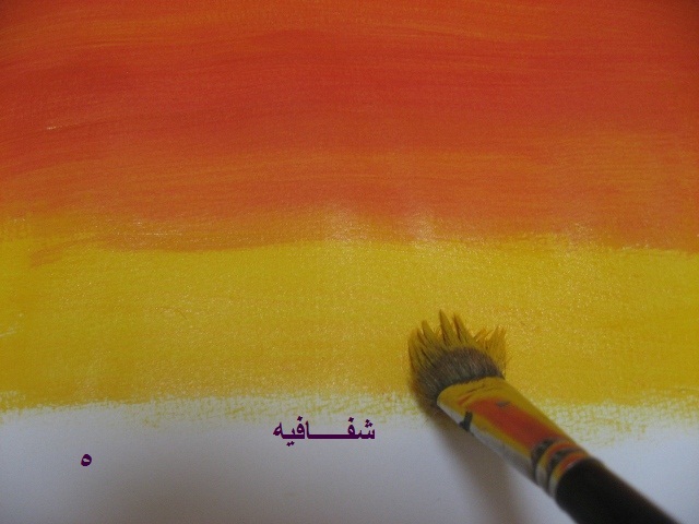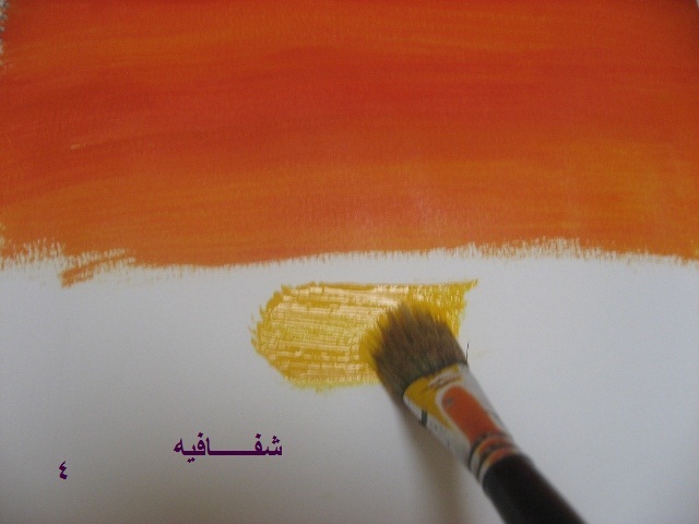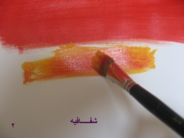 بعدين بنفس الفرشه وبنفس اللون الي فيها(يعني ما نغسلها ولا نمسحها)..ناخذ اللون الاصفر ونخلطه مع الاحمر...طبعا بيطلع البرتقالي..