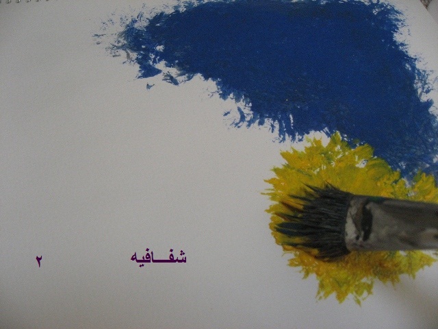 يجي دور اللون الازرق...طبعا نحط اللون بالفرشه بدون ما نمسح الفرشه من اللون الاصفر الي قبله....ليه؟؟