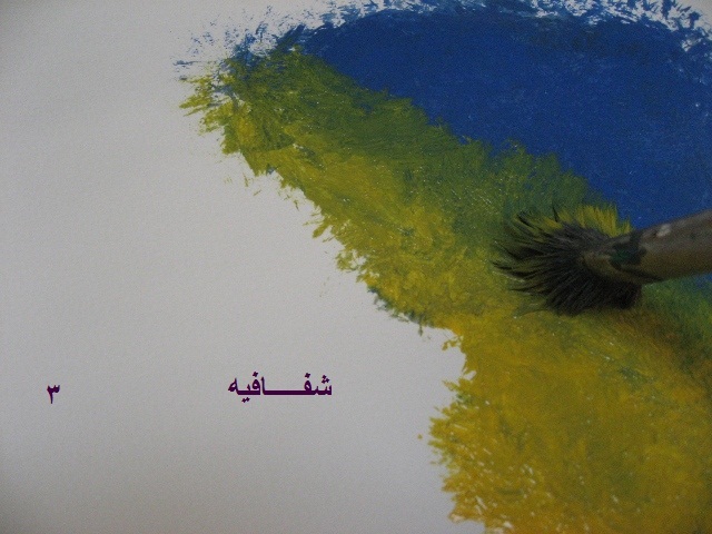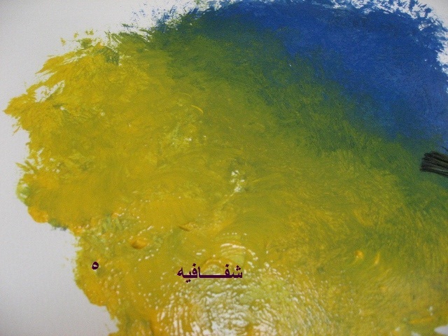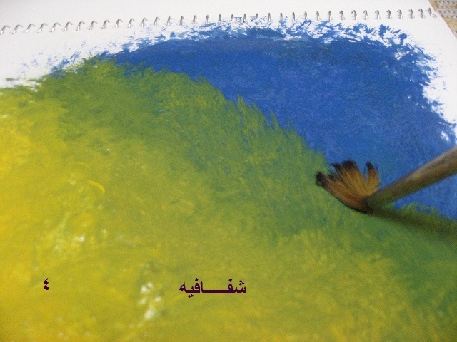 هنا نمسح الفرشه من اللون..وبدون ما نحط لون عليها ..نخلط اللون الاصفر والازرق..حتى ما يكون فيه خط فاصل بينهم..