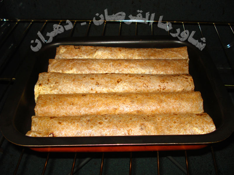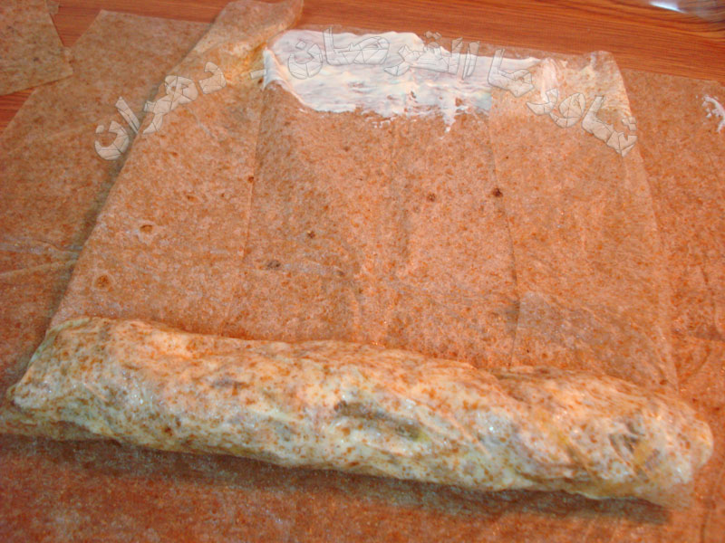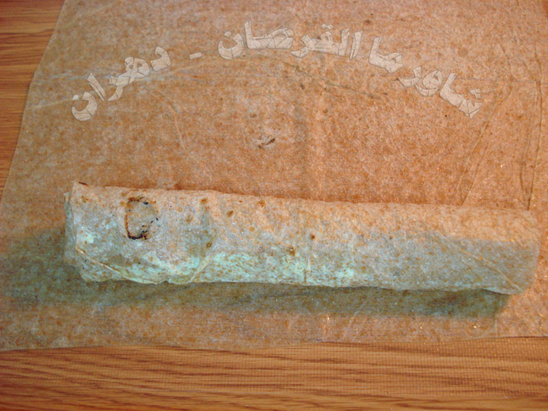 نقطع القرص ونشكله على شكل مستطيل وندهن طرفيه بالجبن والسائل والمايونيز ......