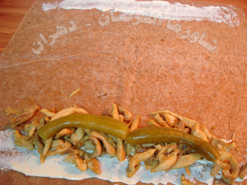 نضع شرائح الدجاج وفوقها طرشي الخيار على الجبن السائل والمايونيز في جهة واحدة من القرص فقط .....