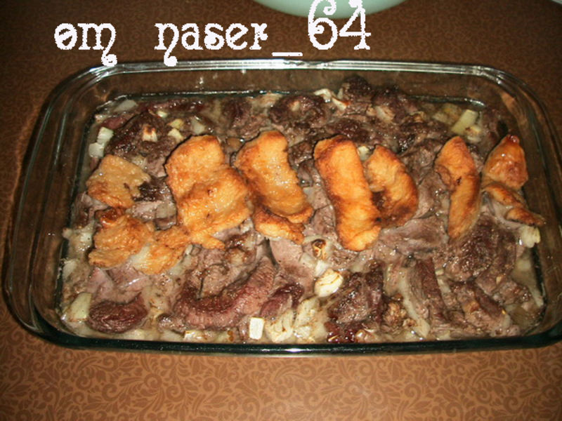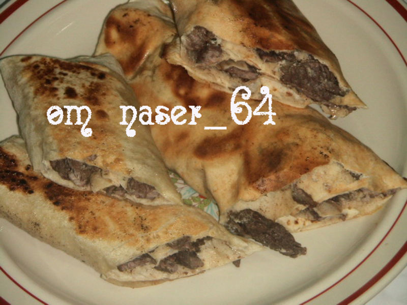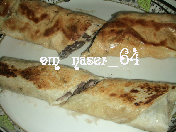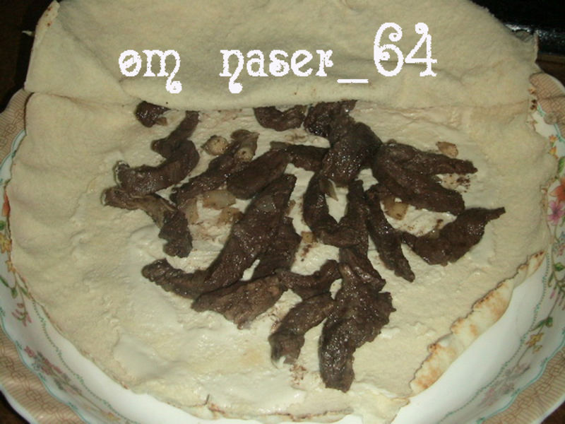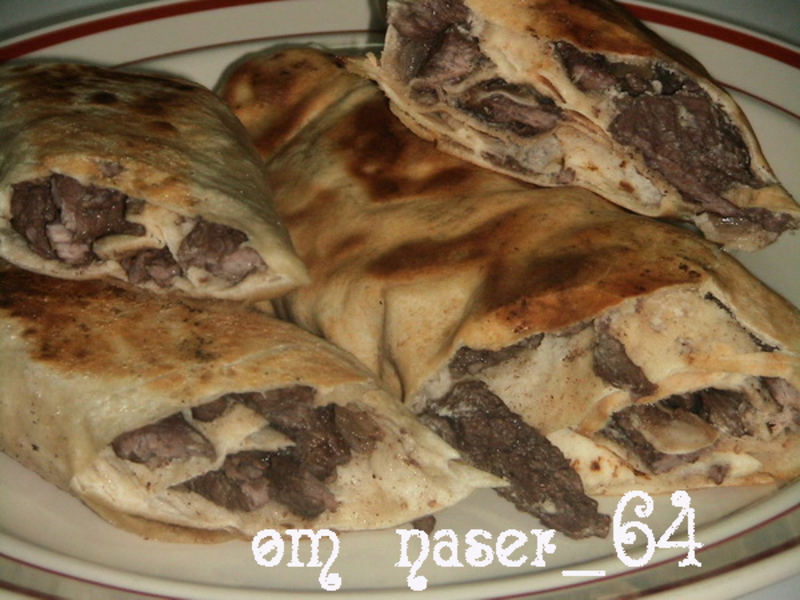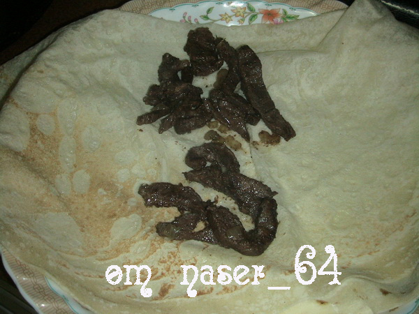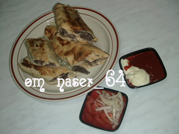 ونضع قطع اللحم عليها وطبعا بامكانك وضع بطاطا مقلية او مخلل وشرحات بندورة وبصل شرحات ولكن الاولاد يفضلوها هكذا على الناشف وقدمنا معها الاشياء كل واحد لوحدهم زود :angry: