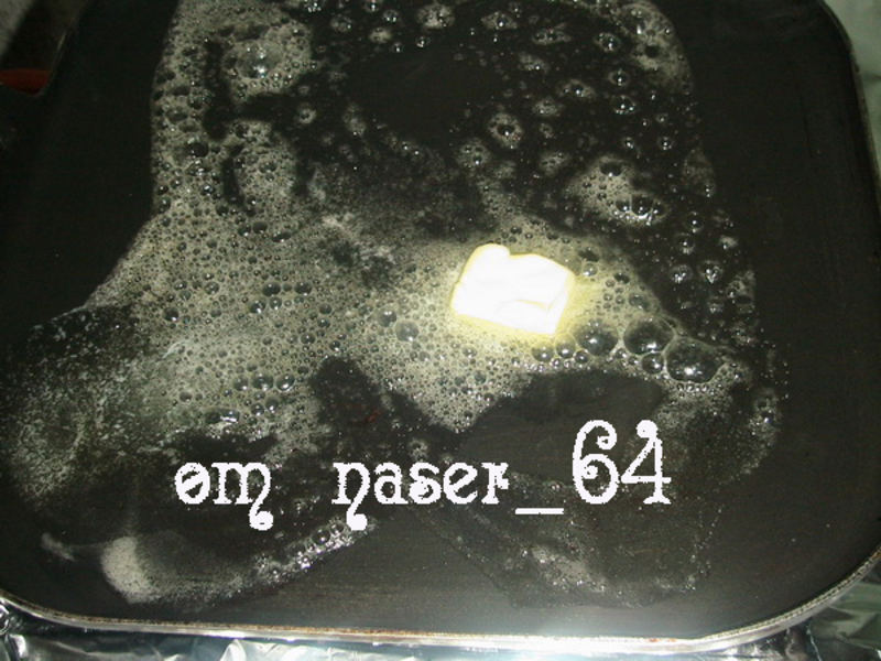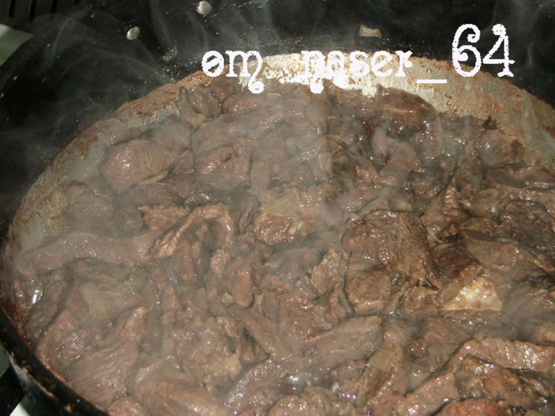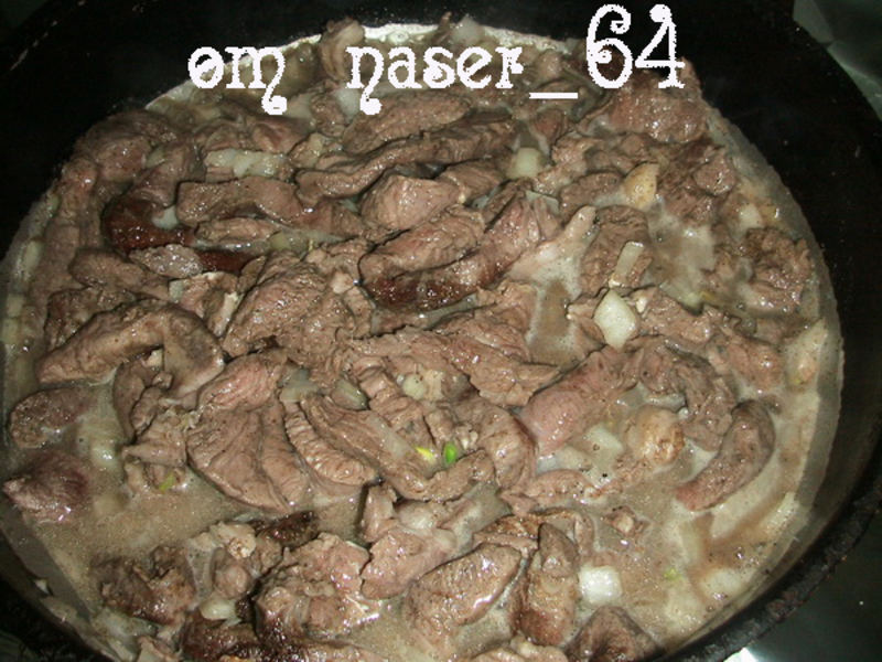 ونضع اللحم في مقلاة على النار ونتركه على نار متوسطة حتى تنشف الماء عنه