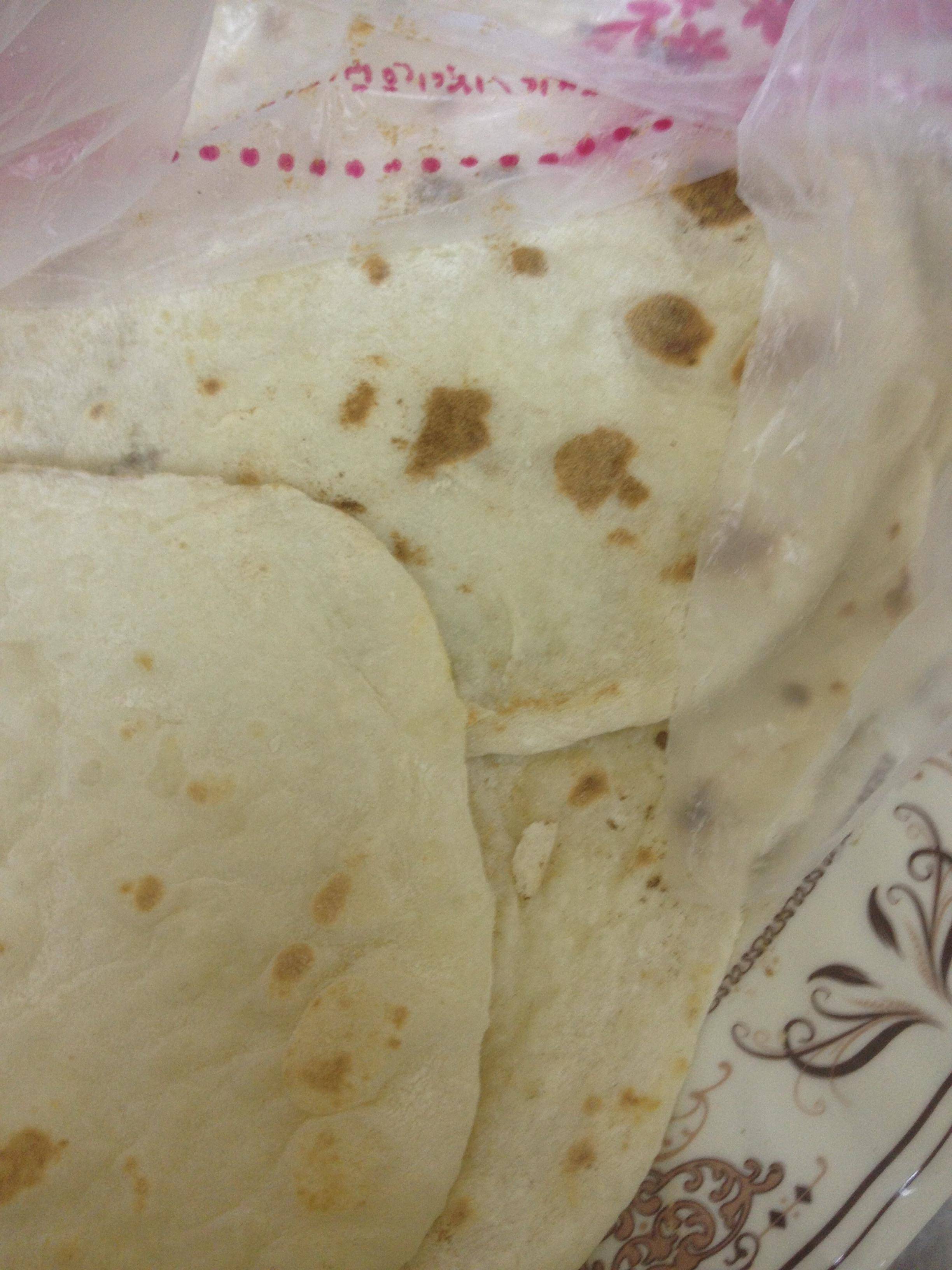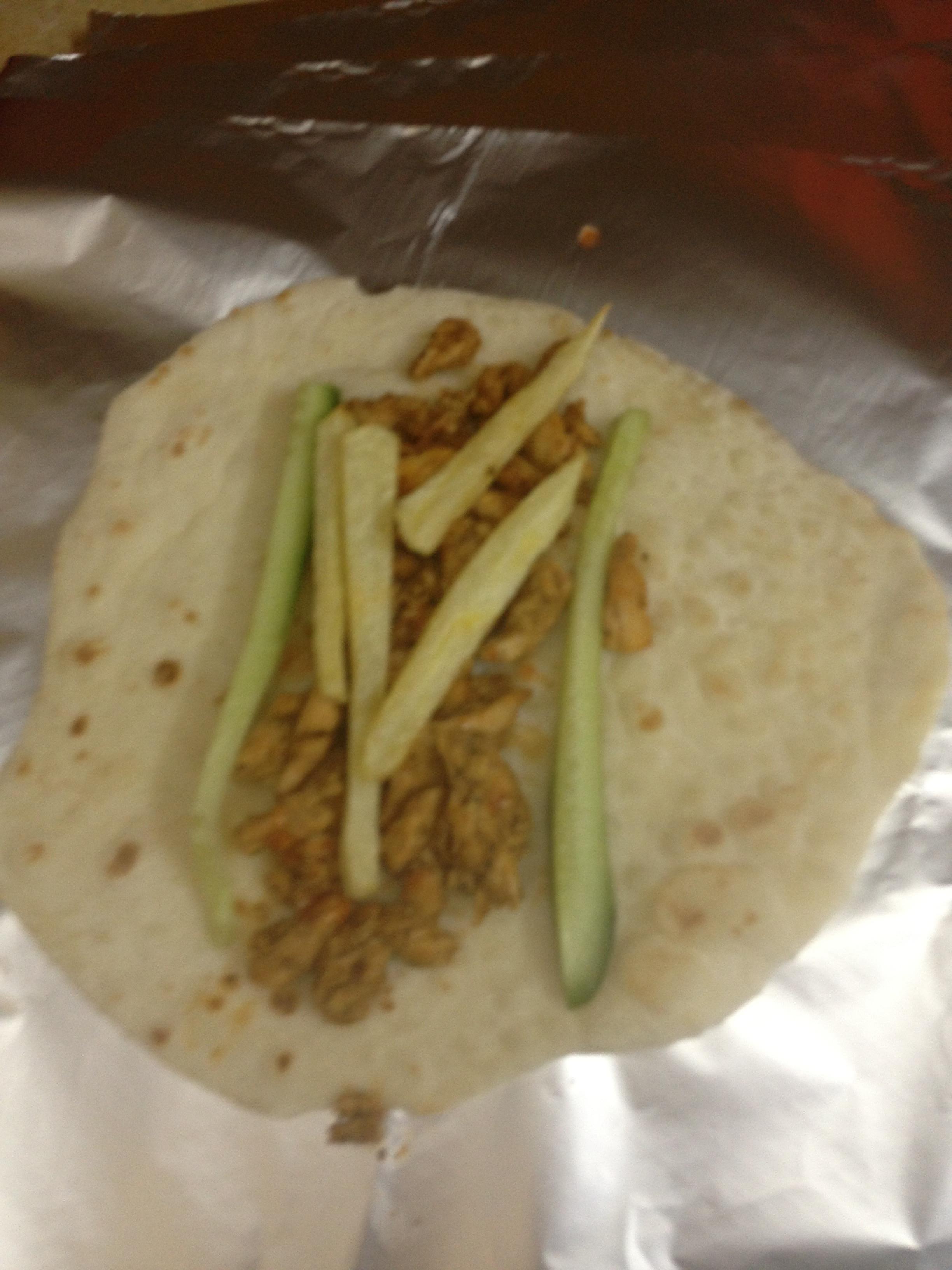 نفرد الخبز اللي سويناه ونحط الشاورما والخيار والبطاطس والشطه