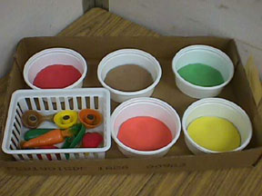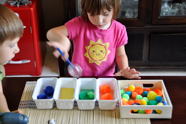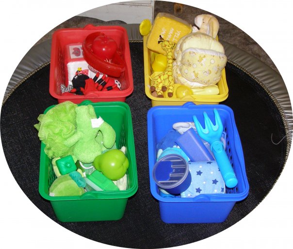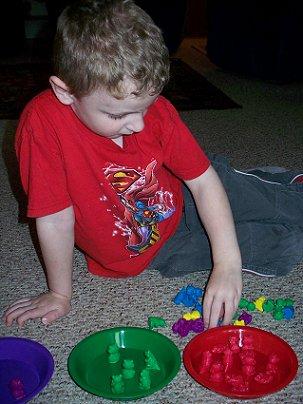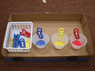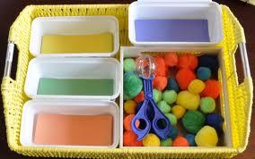ضعي امامه صحون ملونه واعطيه كيس يحتوي علي عدة اشياء ملونة وخليه يفرزها علي حسب اللون