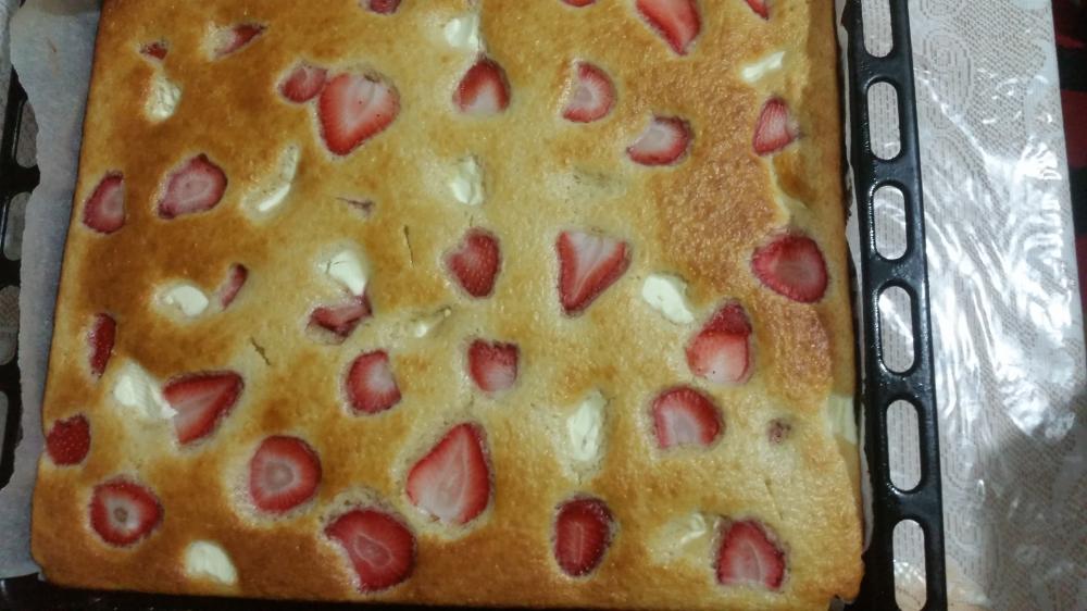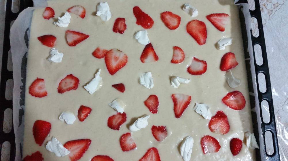 الطريقه نضع جميع المقادير ماعدا الفراوله والجبن في زبديه كبيره ونخفق بحفاق الكيك لمدة دقيقتين ونصف لا نزيد حتي لايخترب الباكنج بودر نفرش صينيه غير عميقه بورق الزبده ونضع الخليط ونساويه نحط الفواكه والجبنه وندخله في فرن 180درجه لين يصير ذهبي من فوق ونغرس السكين يطلع نظيف نقدمه مع العسل او مربي الفواكه او ممكن لوحده
