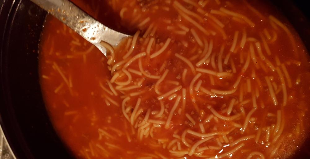 4- نضيف السمنة والشعيرية ونحرك المزيج كل حين لكي لا تلتصق الشعيرية بالقاع ونترك الشوربة تغلي حوالي ربع ساعة