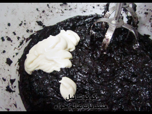 5. نضيف الطبقه البيضا اللى شلناها من الاوريو ونخلط شوي ،، ثم نص علبة القيمر