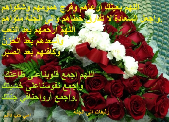 دعواتكم حبيباتي لرتاج العسل وغدا نلقى الأحبه بالشفاء وكشف الضر يارب ارزقهم العافية وشفاء من لدنك لايغادر سقما وارفع عنهم ويسر امرهم وكن معهم وباعد بينهم وبين كل تعب والم ووهن كما باعدت بين المشرق و المغرب..دعواتكم حبيباتي لرتاج العسل وغدا نلقى الأحبه بالشفاء وكشف الضر يارب ارزقهم العافية وشفاء من...