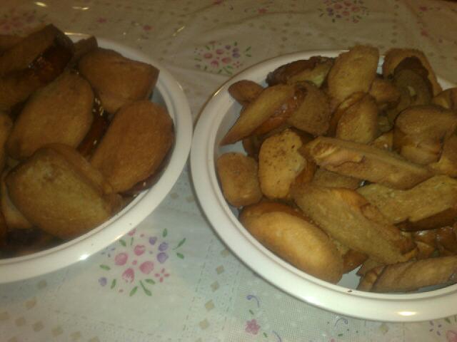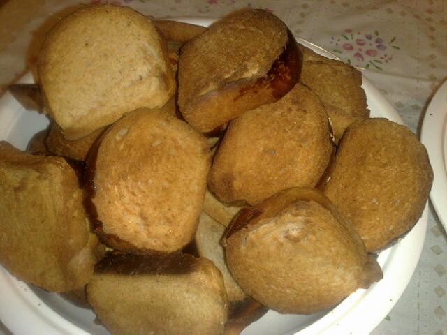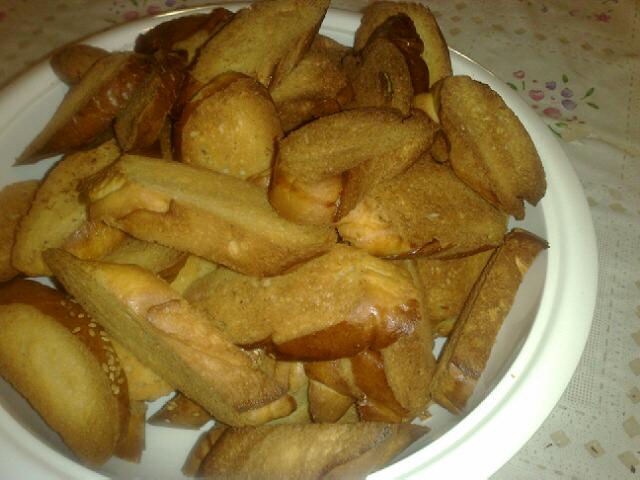 طبعا انا عملت طوال فترة الدورة كميه كبيرة من التوست والصامولي والهمبرجر طبعا بدقيق اسمر ودقيق ابيض ففكرت فكرة حلوة تستغلي الباقي كيف عشان احفظ النعمة ؟انا قمت قطعت التوست والصامولي والهمبرجر شرايح ودخلتها الفرن تحمر شوي وتحولت ل