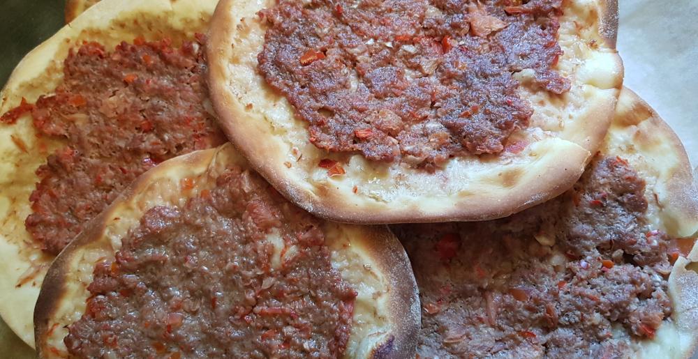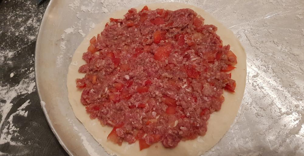 نقطع العجينة ونكورها ثم نمد العجينة علا شكل دائرة ونضع عليها الخشوة وعلا الفرن