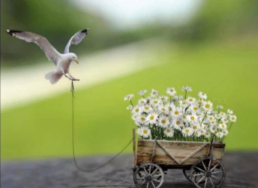 هل الطير يستشير عربة الزهور وهو ممسك بخيطها الحريري
