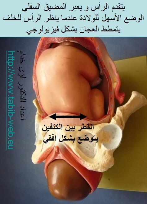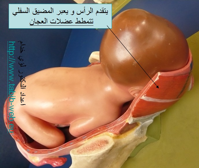 كيف يصحح المجيء انحناءه أثناء المرور بالقناة الحوضية بأن يضع نقرته تحت العانة و يحني رأسه للخلف ـ أو بالآحرى يصحح انحناءه.