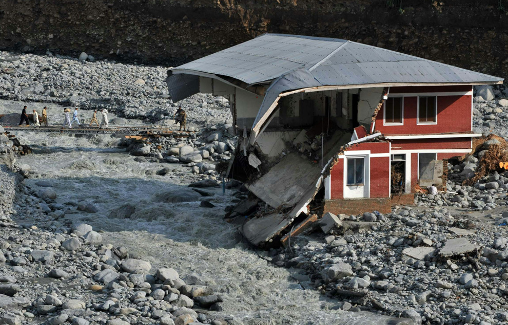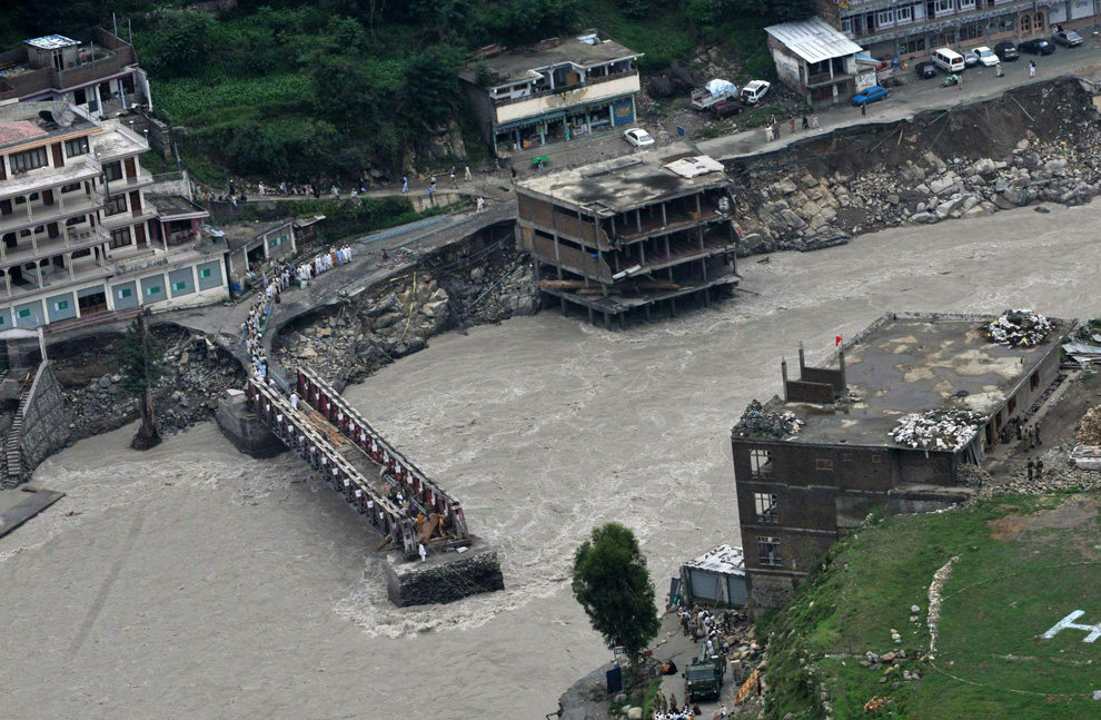 Pakistani flood survivors cross a bridge near a damaged home in Medain, a town of Swat valley on August 2, 2010. (A Majeed/AFP/Getty Images) #