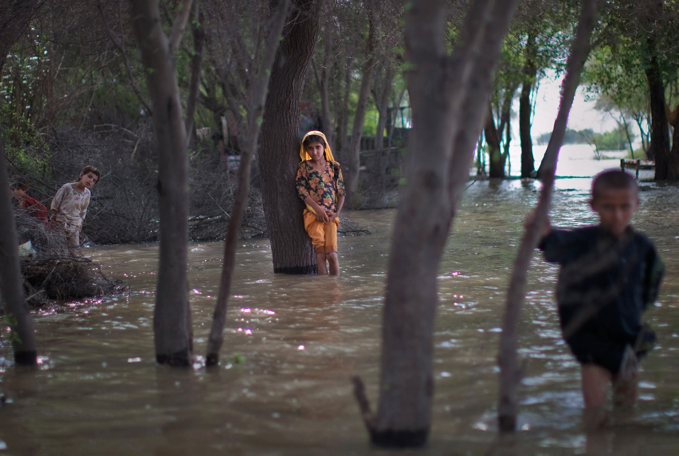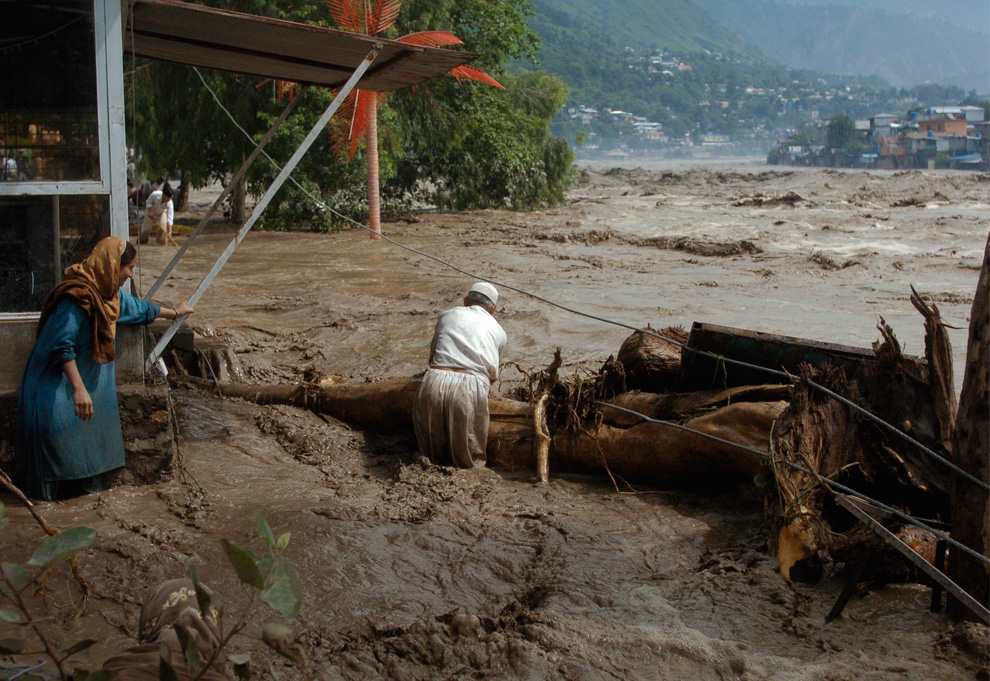 Residents stand by flood water that entered a residential area of Muzaffarabad, Pakistan on July 30, 2010. (SAJJAD QAYYUM/AFP/Getty Images) #