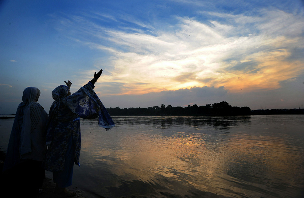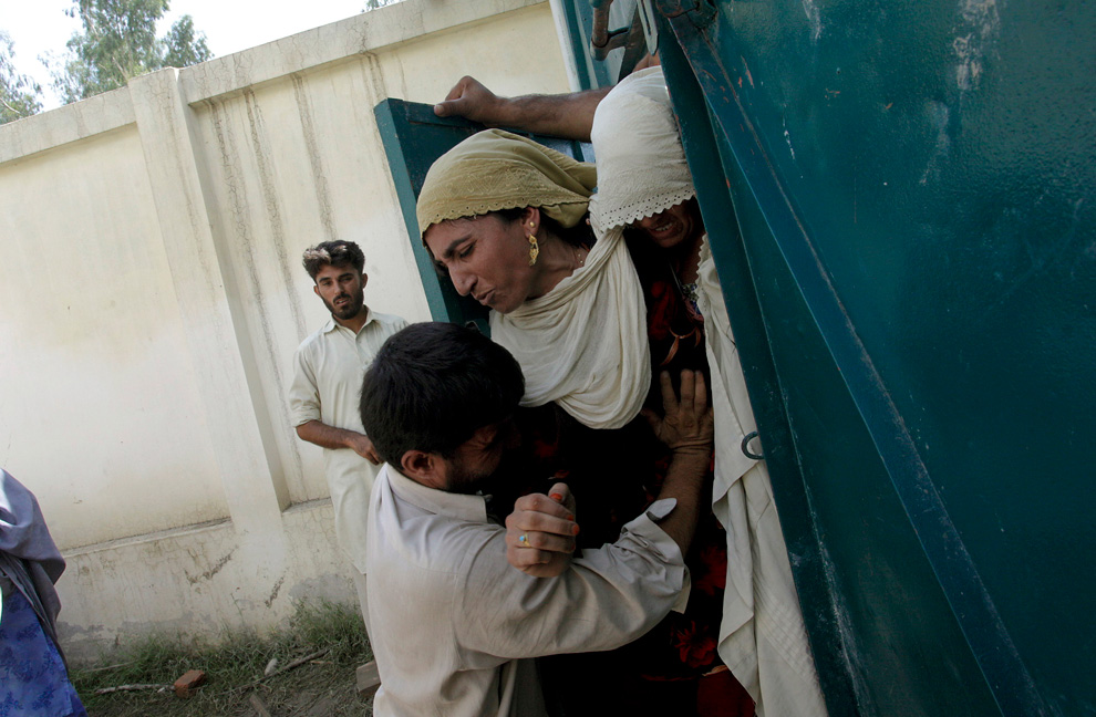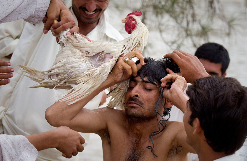 Residents help a man untie a chicken from his neck after he evacuated his flooded home with the fowl by swimming to higher grounds in Nowshera, Pakistan on August 1, 2010. (REUTERS/Adrees Latif) #