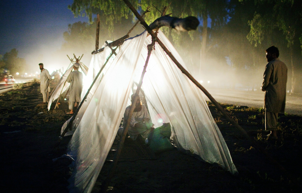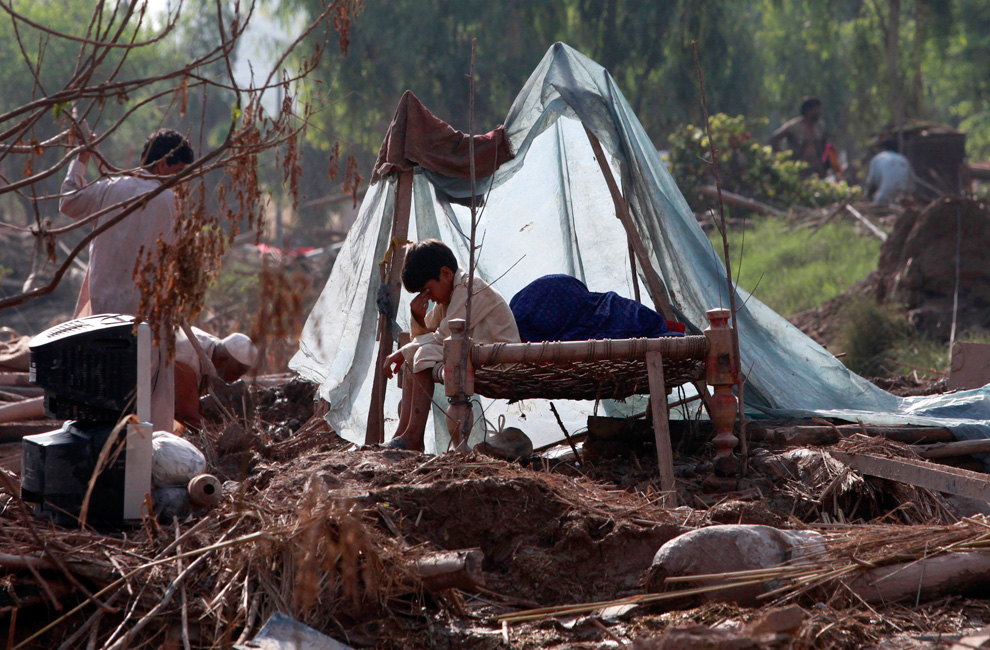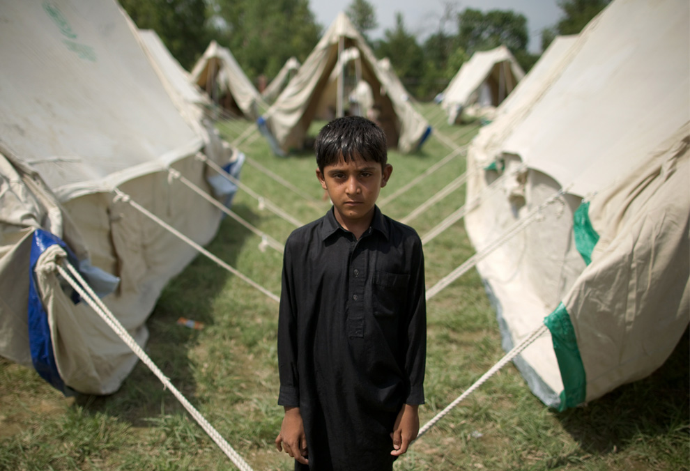 A Pakistani boy named Jeeshan stands outside his tent in a camp set up by the Pakistani army inside a college on the outskirts of Nowshera on August 2, 2010. (BEHROUZ MEHRI/AFP/Getty Images) #