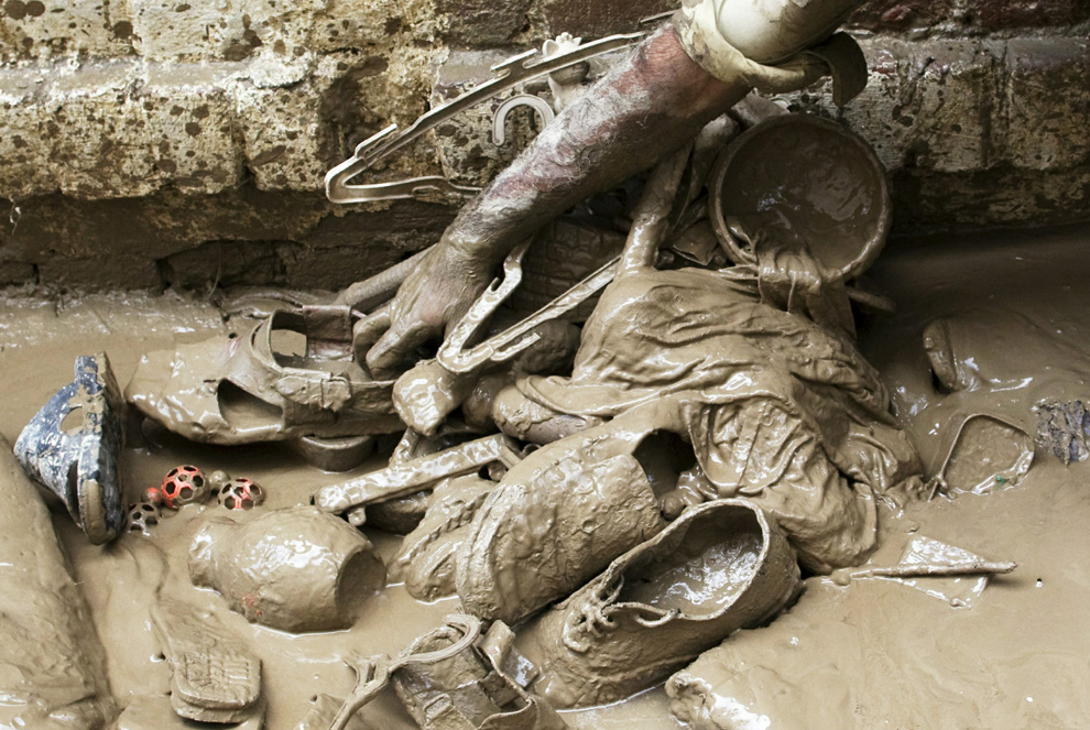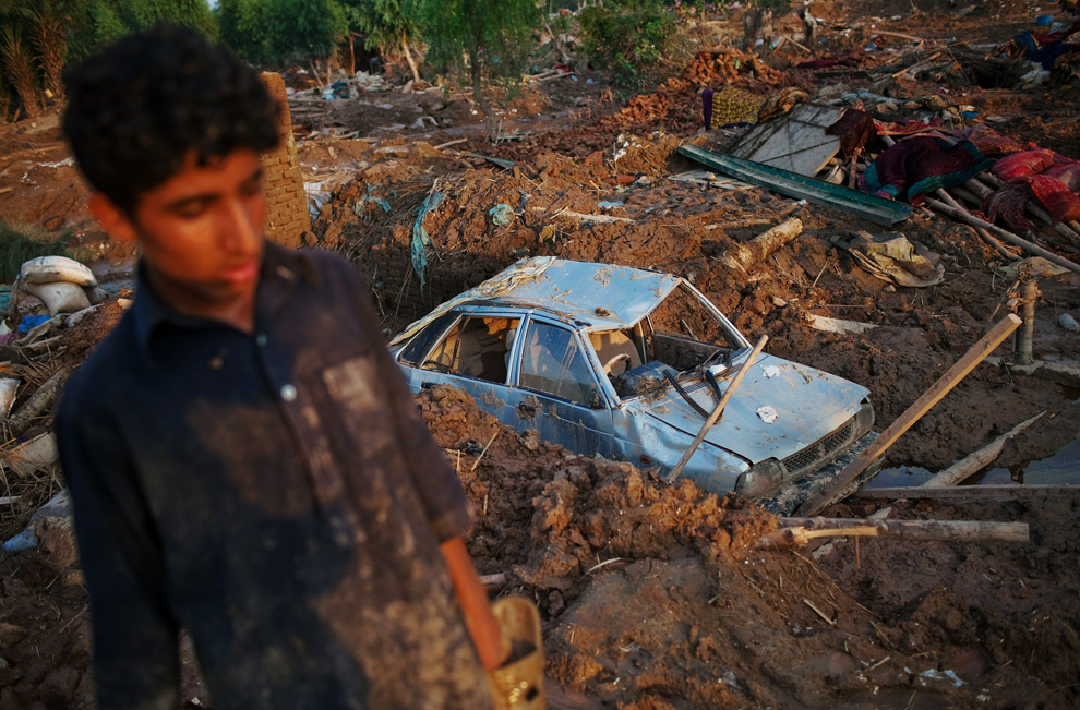 Residents watch water pour through a street on the outskirts of Peshawar, Pakistan on July 28, 2010. (A Majeed/AFP/Getty Images) #