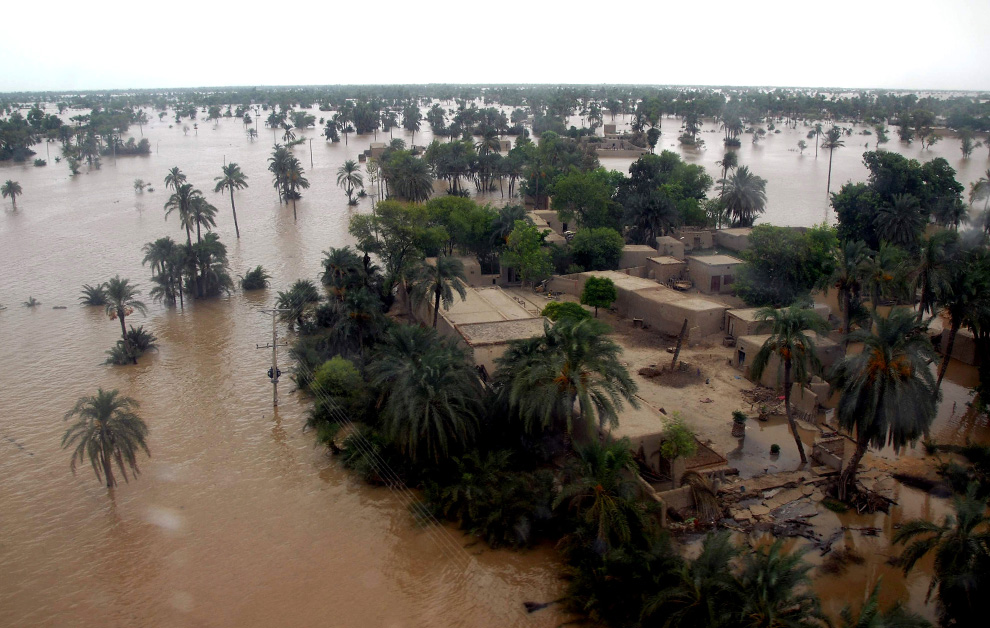 An aerial view of a man and his animals surrounded by floodwater in Taunsa near Multan, Pakistan, flooded on Sunday, Aug. 1, 2010. (AP Photo/Khalid Tanveer) #