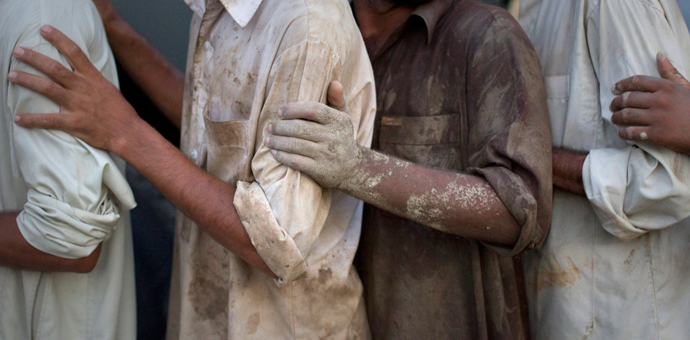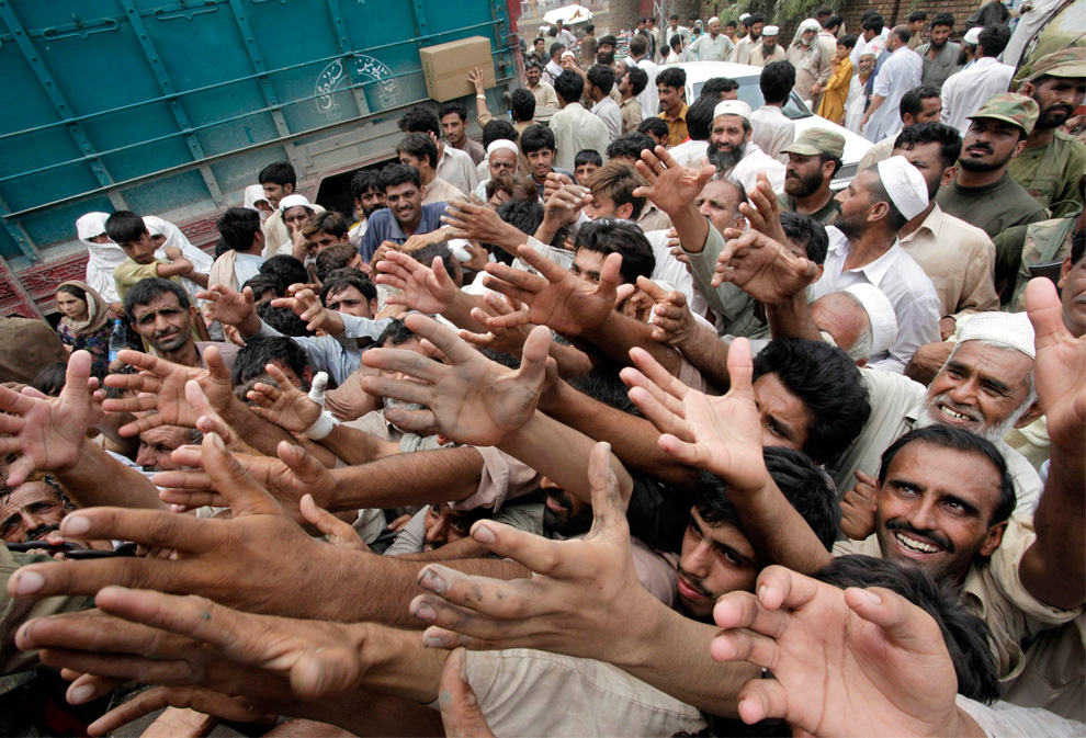 A boy is flung back by the force of a Pakistan Air Force helicopter rotors as it drops water supplies to residents on August 2, 2010 in Nowshera, Pakistan. (Daniel Berehulak/Getty Images) #