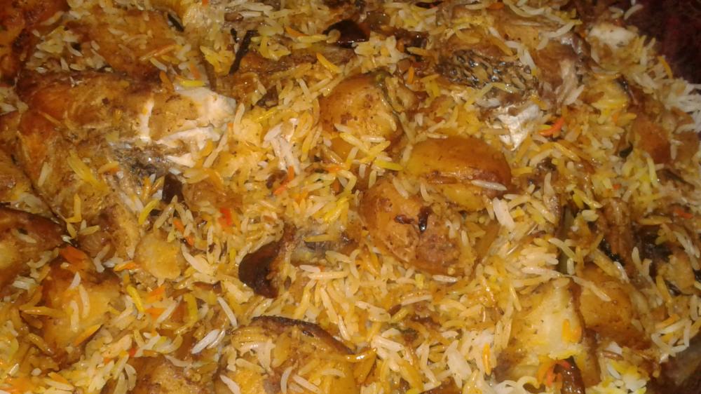 تجيبي القدر تحطي له نص كميه البصل المقلي وتحطي من الزيت الي قليتي فيه البطاطس والسمك وتحطي نص ثومه مبشوره وتحركيهم وتحطي البطاطس وتقلبي مع ملعقه قرفه مطحونه وملعقه هيل مطحون وحبتين مسمار ونص فلفل بارد مقطع وملعقتين صلصة وخليط الخلاط وقلبي وشوي ملح وبهارات كاري وكمان كزبره مطحونه. وشوي كزبره وبقدونس تحطي السمك فوق البطاطس من دون ماتحركي السمك حتى لا يفتت تجيبي الرز تحطيه فوق السمك والبطاطس بدون ماتحركي الرز تصبي القليل من الماء ولا تغمريه بالماء تحطي شوي زعفران مطحون مع شوي ماء وتسكبيه عن يمين الرز وكركم مع ماء وتصبيه يسار واجهه الرز والوسط تخليه ابيض وتحطي بقيه البصل المقلي على واجهه الرز وشوية من الزيت الي قليتي به السمك تحطي القليل بالواجهه وتغطي القدر وع نار هاديه جدا حتى لاتحترق من تحت وتبخريه بفحمه وكل شوي تفتحي القدر تضيفي شوي ماء حتى ينضج