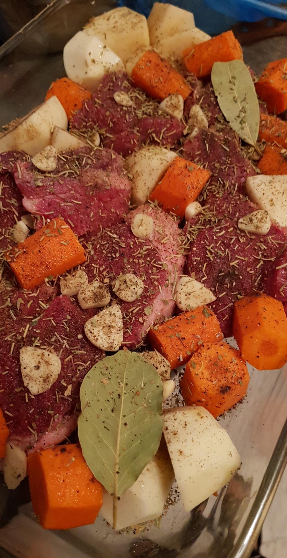 في صينية كبيرة عميقة القاع ، ضعي اللحم ثم البطاطا والجزر والثوم. أضيفي الملح ، ثم كل الأعشاب الطازجة والمجففة. يرش اللحم بالملح والبهار ثم يرش بزيت الزيتون. صبي المرق في قاع الصينية.