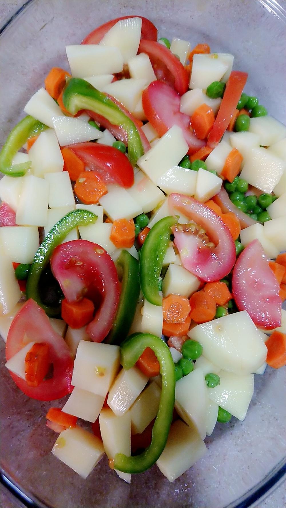 بعدين في صينية الفرن طبقه من الخضار المشكلة أضفت لها ملح فقط