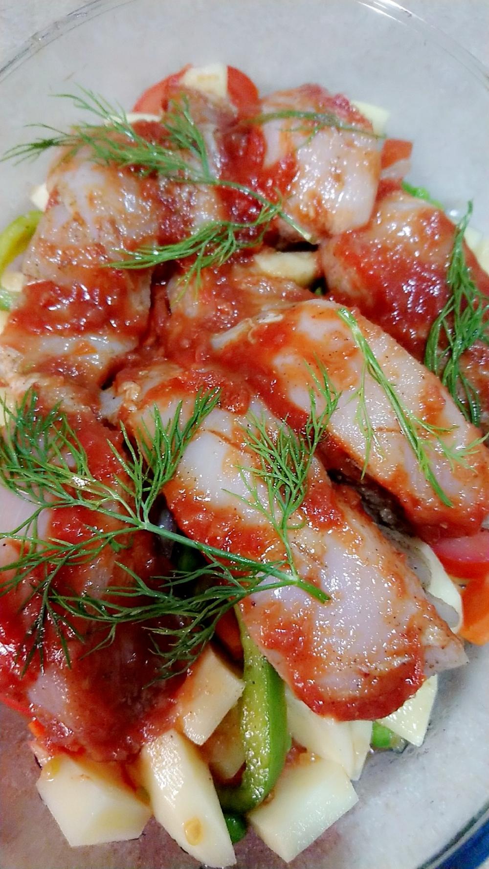 وخلطت ملعقتين معجون طماطم مع ربع كوب ماء وملعقتين زيت وصبيتها ع الدجاج ووزعت عليها شبث