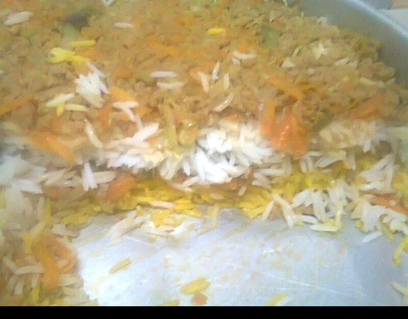 نحضر صينية بايركس مستطيلة <<<انا استخدمت دائرية نضع أولا طبقة من الرز ثم جزء من الحشوة ثم طبقة ثانية من الرز ثم الحشوة وتواسى عليه ثم يقصدر جيييييييييدآ ويدخل قليلا الفرن من ( 15-10 ) دقيقة