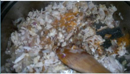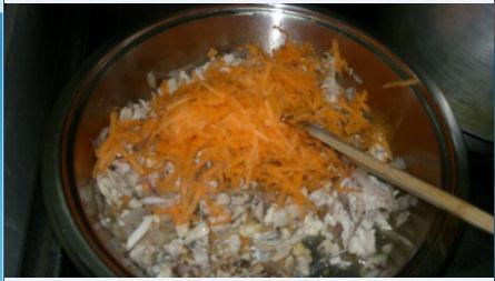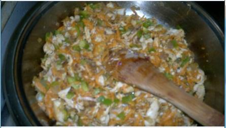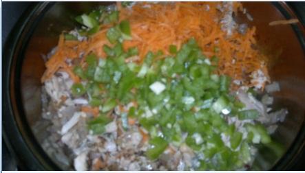 نضيف عليه الدجاج المفتت ثم البهارات والماجي والملح ثم الجزر المبشور ثم الفلفل المقطع