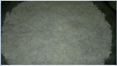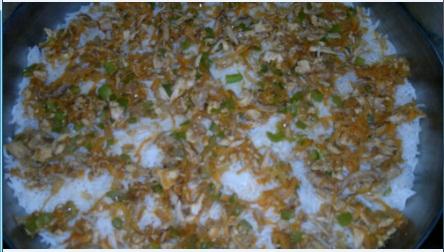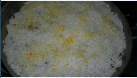 ونجهز صينية ونفرش عليها الرز كطبقة اولى