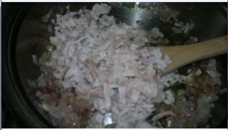 ثم نضيف عليها الطبقة الثانية وهي حشوة الدجاج المفتت