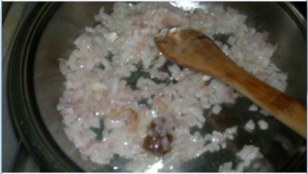 في نفس الوقت نحمس البصل مع الزيت في مقلاة لحد مايذبل