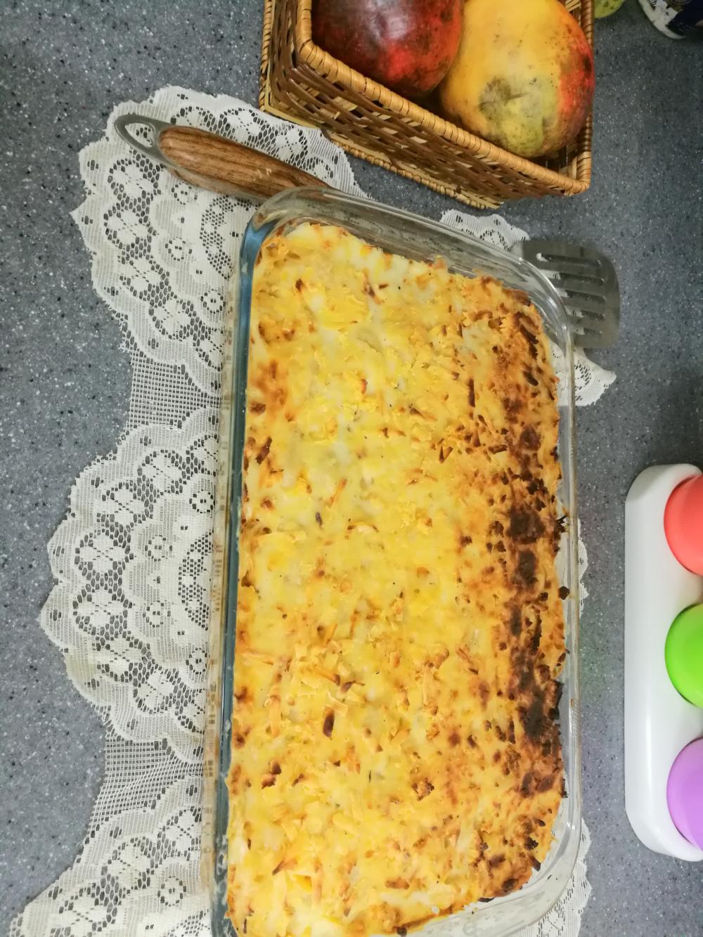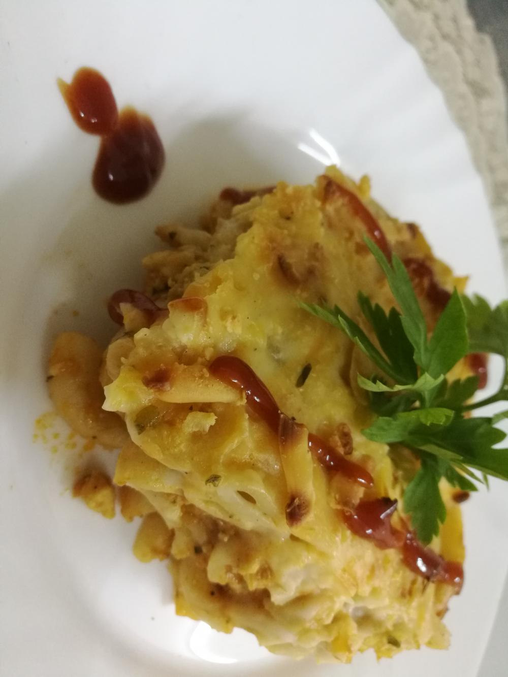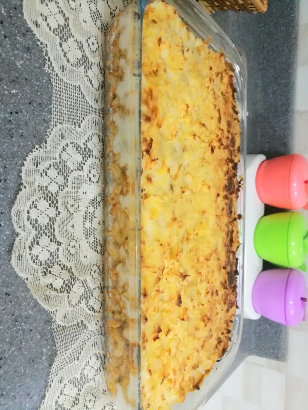 والان صار كل شيء جاهز حطيت المكرونة في ايناء واضفت لها الصلصة والكفتة وخلطتهم ورصيتها في الصينية وحطيت فوقها البشاميل والجبن المبشور استخدمت الجبن الاصفر ودخلت الفرن اول شيء شغلت الفرن من تحت وبعدين من فوق .