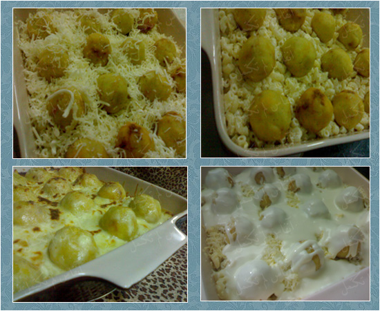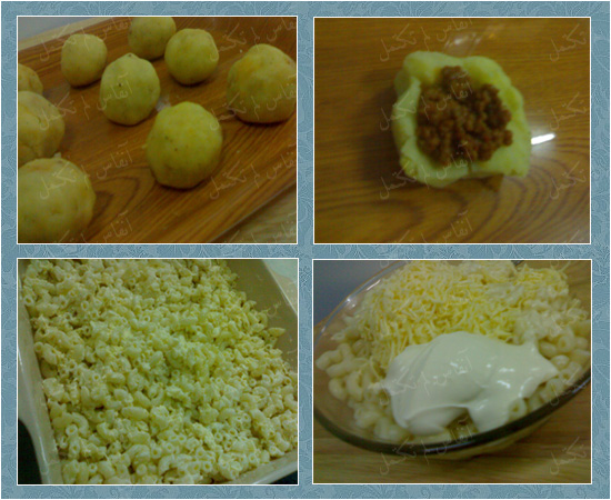 توضع كرات البطاطس فوق المكرونه .. ثم ترش بجبن الموزريلا والقشقوان ..