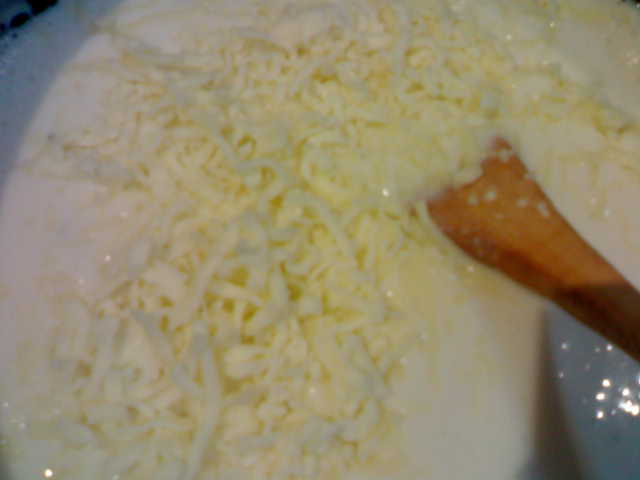 طبعا بعملها مثل الارشادات بس بقلل من الحيب شوي لاني بحبها ثقيلة بس تبدأ تشتد الخلطة بشيلها عن النار وبحط عليها جبنة موتريلا وبرجعها على النار وبقلبها حتى تذوب الجبنة ويشتد البشاميل