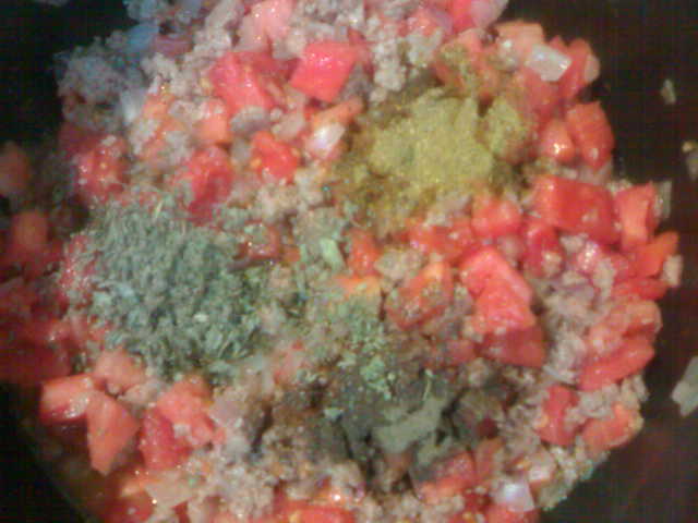ثم نضع البهارات المشكلة والفلفل الاسود والزعتر الناشف وما تحطي ملح عشان ما تذوب البندورة كثير وخليها على النار حتى تنشف ميتها منيح مع التقليب كل شوي لما تطفي النار عليها حطي الملح على الخلطة