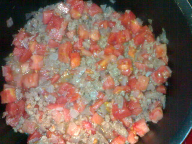 بنقشر البندورة وبنقطعها مثل ما بتقطيها للسلطة بس اكبر شوي وبنحطها مع اللحمة وبنقلبها