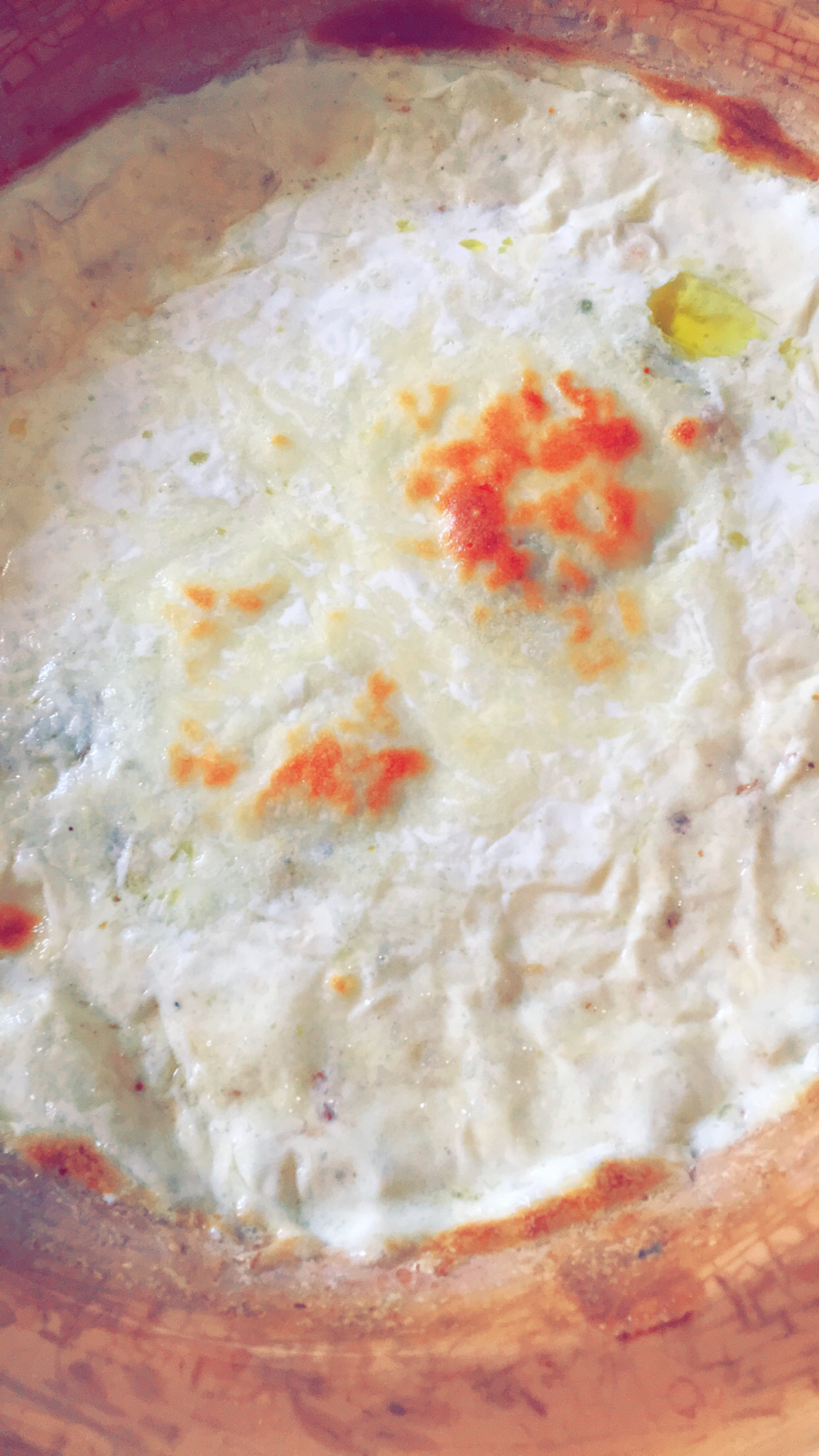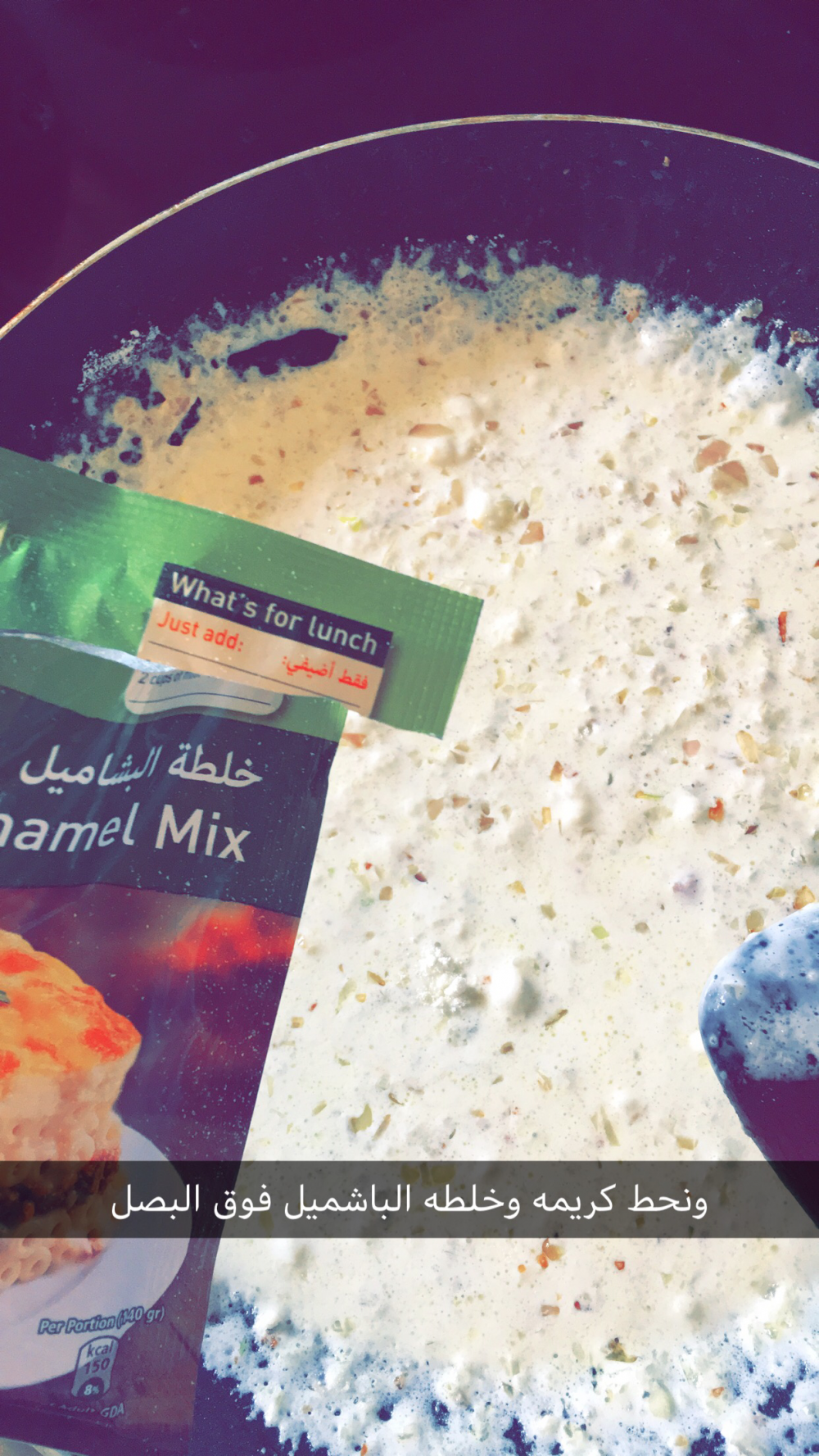 بنفس الصاج نحط البصل والثوم ونشوحه الين مايذبل وبعدين نضيف الكريمه والباشميل ونخليه صوص. قووامه وسط ونضع ملح عليهاا