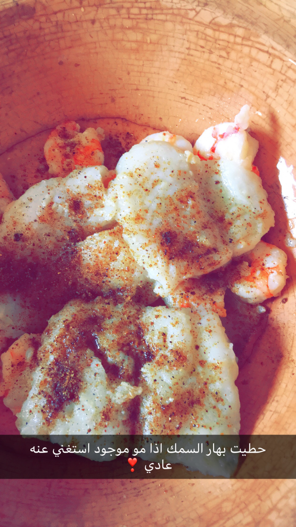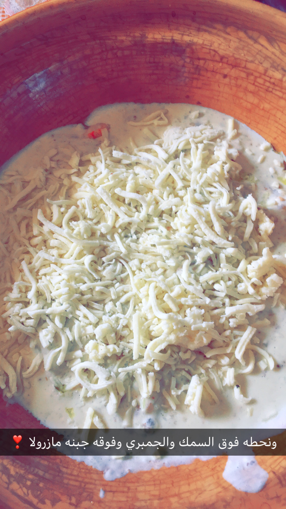 ونسكبه فووق السمك والروبيان ونحط فوقه جبن مازرولا