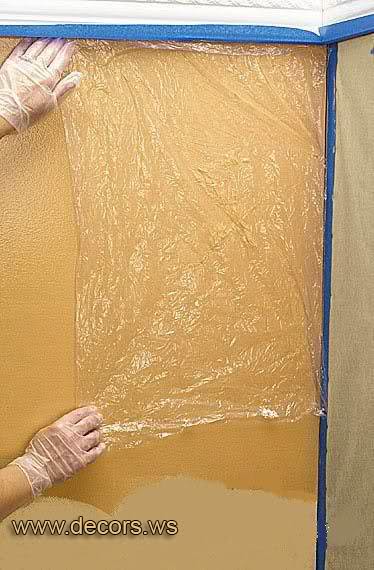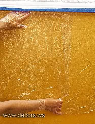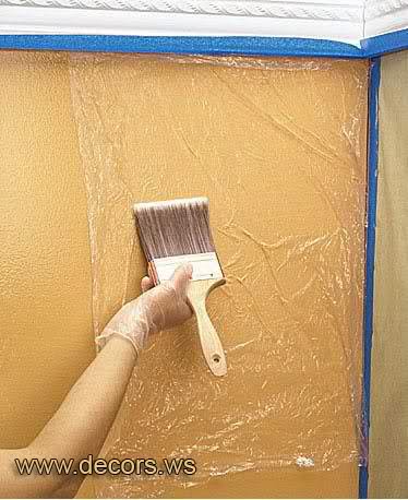 وقبل لا تنشف البويه ( الدهان ) أحضر قطعة نايلون ومدها على الجدار