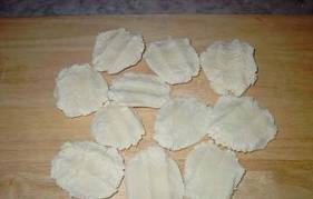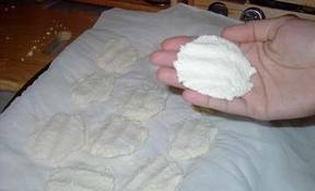 بامكانك تسريع عملية تجفيف المصل عن طريق شخل المصل ثم إعادة كتلة اللبن المتجبنة على النار الهادئة حتى يجف السائل تقريبا .. بعد ذلك ارفعي القدر من على النار واتركي اللبن المتجبن يصل إلى درجة حرارة الغرفة ثم ابدأي بالعجن حتى تتحول إلى عجينة واحدة .. قومي بعمل كرات صغيرة بحجم حبة الليمون الصغيرة مع ( العبط ) ثم اعمليها على شكل اقراص مع وضع شكل اصبع