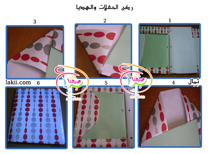 1- نقص من ورق التجليد جزء يكون مقاسه اكبر بقليل من مقاس الدفتر ندخل الحواف الورق الى الداخل من الجهة العليا