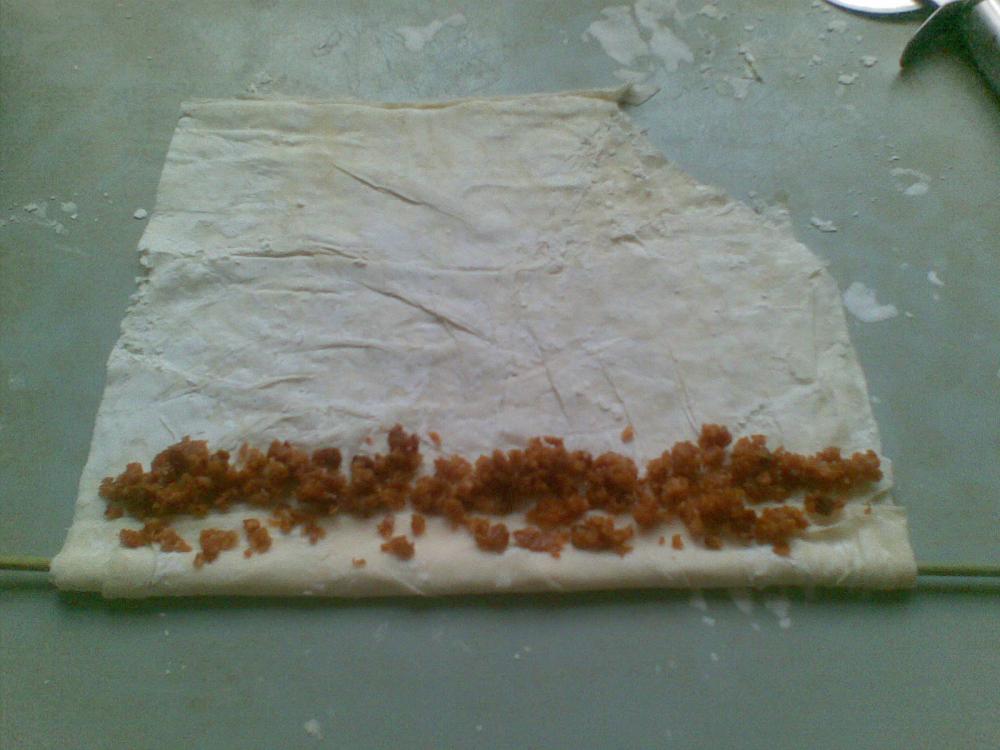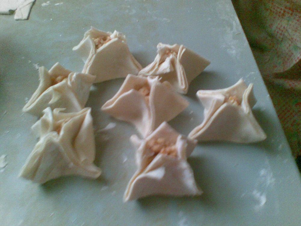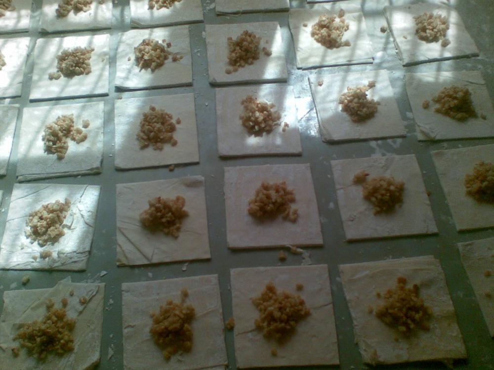 بعد ما فردت العجينة كبيرة قطعت مربعات 8 سم و حشيتها مكسرات مع قليل من السكر و رشات من ماء الزهر و قليل من القرفة و سويتها مثل الصورة و وضعتها واحدة جنب الاخرى في الصينية حتى لما تدخل الفرن ما تنفتح كثير