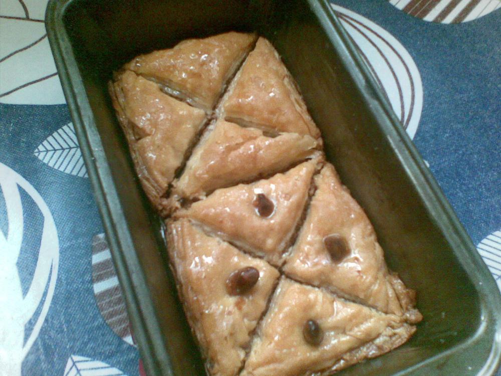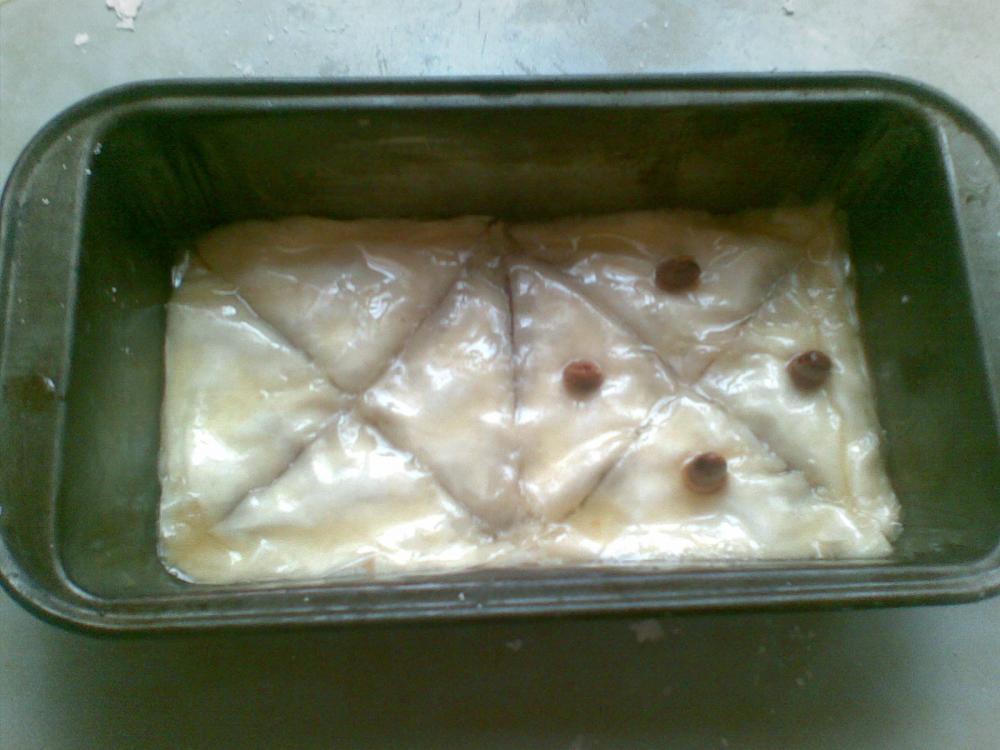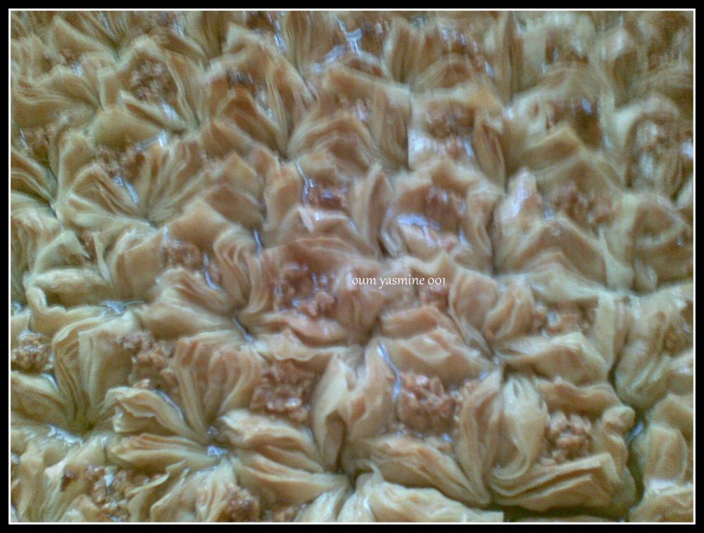 و النتيجة بعد مدة في الفرن مشغل من تحت فقط و نتلركها حتى تتحمر من تحت و فوق و بعد خروجها نتركها تبرد و نشربها بالعسل المخفف بشوية شيرة