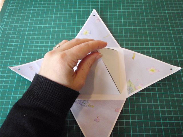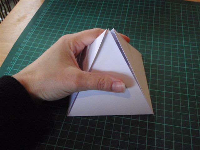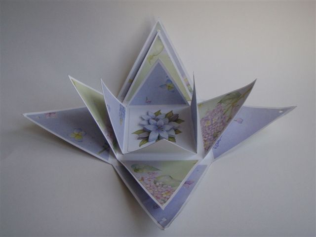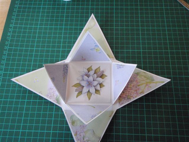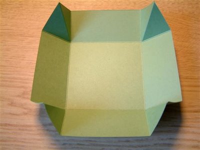 وهذه أخرى طريقة العمل نرسم مربع ومن منتصف طول كل ضلع يمكن رسم عمود بنفس طول المضلع ونصل رأس كل عمود بطرفي كل ضلع من أضلاع المربع ليتكون لدينا هذا الشكل نقص الشكل ونثني أضلاع المربع سيتكون لدينا هذا الشكل يمكن رسم مثلثات على أوراق مزخرفة أو ملونة بحجم المثلثات في الشكل السابق ويمكن عمل نفس الفكرة ولكن بحجم أصغر ( كما فعلنا في الصندوق السابق ) ليكون لدينا عدة أحجام ممكن إلصاقها مع بعضها البعض يمكن عمل رسمة تدل على المطوية أو كتابة اسم المطوية وإلصاقها في المربع الخاص بأصغر حجم في الشكل السابق يتم بعد ذلك إلصاق الشكل فوق بعضه البعضوهذه أخرى طريقة العمل نرسم مربع ومن منتصف طول كل ضلع يمكن رسم عمود بنفس طول المضلع...
