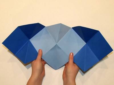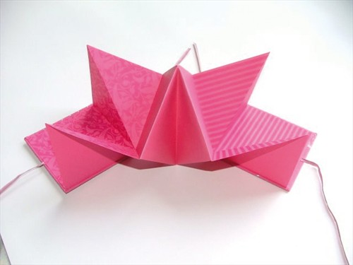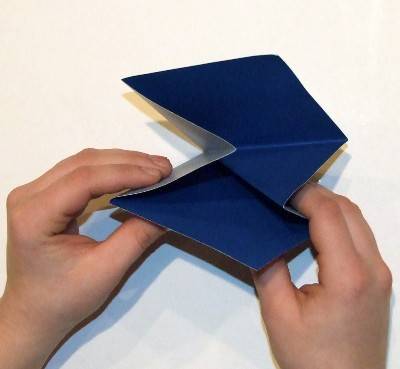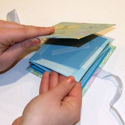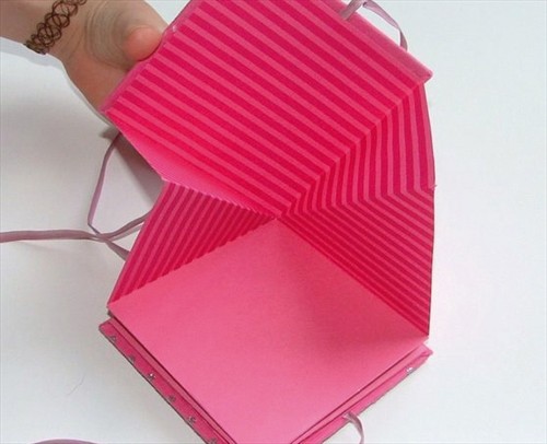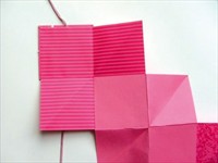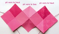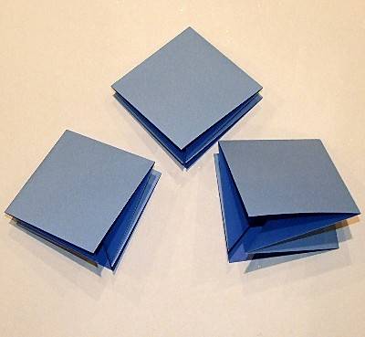 وهذا نموذج آخر المطلوب للغطاء مربعين من الورق المقوى مقاس 11سم في 11 سم مربعين من ورق التغليف ( مزخرف ) مقاس 14 سم في 14 سم شريط ساتان شريط لاصق من الجهتين أو صمغ لداخل الألبوم أو المطوية المطلوب 3 مربعات مقاس 20,5 في 20,5 سم من الورق الملون الصالح للإستخدام من الجهتين طريقة العمل يتم تغليف الورق المقوى ( الغطاء ) بورق التغليف وتثبيت شريط الساتان من الداخل على القاعدة نأخذ الأوراق المربعة الثلاث ذات القياس 20,5 في 20,5 سم ونقسمها بالقلم والمسطرة من المنتصف إلى 4 مربعات ونرسم أحد الأقطار فيها كما هو واضح في الشكل السابق نقوم بطي الخطوط التي تم رسمها كما في الشكل السابق نقوم بثني الطر للداخل كما في الشكل السابق نقوم بنفس العمل في جميع المربعات الثلاث الآن نقوم بفرد المربعات الثلاث وتثبيتها مع بعضها كما هو واضح في الشكل السابق نقوم بتثبيت المربعات الثلاث على ورقتي الغلاف بالشريط اللاصق من الجهتين بحيث يكون مربع الغطاء الذي يحوي شريط الساتان في الأسفل وهذي هي النتيجة النهائية ويمكن تدوين مانريد كتابته على المطوية في الداخل أرجو أن تكون الفكرة والشراح واضحينوهذا نموذج آخر المطلوب للغطاء مربعين من الورق المقوى مقاس 11سم في 11...
