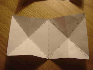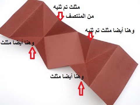 حبوبة الورقة عبارة عن مستكيل 4إنش في 12 إنش أثني الورقة من المنتصف بالضبط بحيث تكون مستطيلان منتطابقان أفردي المستطيل مرة أخرى وأعملي هذا الشكل أفردي الورقة مرة أخرى وأعملي نفس الشكل بالإتجاه الآخر ستلاحظي أنه تكون لديك نفس هذا الشكل تماما من الجهة السفلية أثني هذه المثلثات من المنتصف للداخل ستجدين أن هذا الشكل تكون لديك أنظري هنا يارب تكون واضحةحبوبة الورقة عبارة عن مستكيل 4إنش في 12 إنش أثني الورقة من المنتصف بالضبط بحيث...