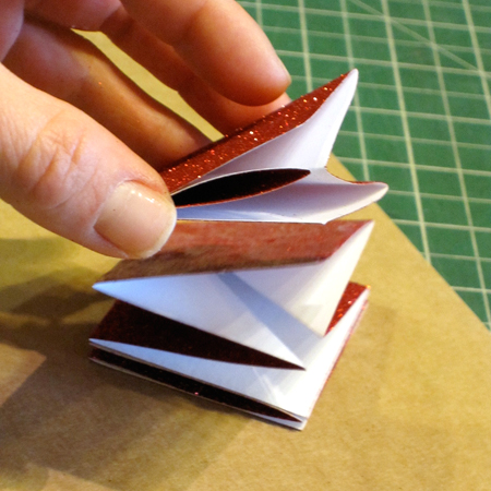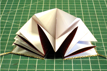 المطلوب ورق كرتون مقاس 4,5 إنش في 4,5 إنش عدد2 ورق تغليف مقاس 6 إنش في 6 إنش عدد 2 ورق عادي لكتابة المطوية مقاس 8 إنش في 8 إنش العدد الذي ترغبينه شريط ساتان صمغ كيفية العمل تتبعي الصور الصقي كرتونة الغلاف ( الورق المقوى ) على ورق التغليف وقصي الزوائد كما قي الصورة إنتهينا من تغليف غلاف المطوية الآن نبدأ في عمل المطوية تتبعي الصور أثنيها بهذا الشكل أي بتنصيف الأضلاع ثم أفرديها وأثنيها بالإتجاه الآخر أي بعد الثني سيتكون لدينا 4 مربعات واضحة على الورقة أفردي الورقة ثم أثنيها بشكل قطري مرة واحدة ( أي يتضح لنا قطر واحد للورقة ) تكون الآن لدينا 4 مربعات ( السابقة ) مثنية أثنان منهم فقط مقسومان قطريا الآن أدخلي أقطار المربعين للداخل ليتكون لدينا هذا الشكل قد نكتفي بإستخدام ورقة واحدة أما إذا كانت المطوية تتطلب أكثر من ورقة فنقوم بالعمل نفسه على جميع الأوراق وبعدها نقوم بإلصاق الآوراق جميعها مع بعضها البعض بهذا الشكلالمطلوب ورق كرتون مقاس 4,5 إنش في 4,5 إنش عدد2 ورق تغليف مقاس 6 إنش في 6 إنش عدد...